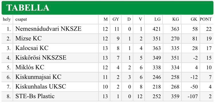 A tabellán továbbra is őrizzük a második helyünk,és egy mérkőzéssel kevesebbet játszva is két pont az előnyünk a kalocsaiakkal szemben.Az alapszakaszból még két találkozónk van hátra. Vasárnap a Miklós KC látja vendégül a mienket.